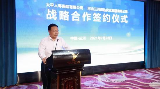 三河市燕郊高新區(qū)黨工委書記、管委會主任崔浩泉在致辭中表示:兩大集團(tuán)的攜手,是優(yōu)勢互補(bǔ)、強(qiáng)強(qiáng)聯(lián)合,將推動燕郊經(jīng)濟(jì)高質(zhì)量發(fā)展,將壯大燕郊醫(yī)療健康產(chǎn)業(yè)規(guī)模、延伸產(chǎn)業(yè)鏈條,將促進(jìn)燕郊健康產(chǎn)業(yè)與保險產(chǎn)業(yè)的良性互動,提升燕郊醫(yī)療健康產(chǎn)業(yè)整體水平。希望雙方精誠聯(lián)合、精準(zhǔn)對接,開展多層次、多領(lǐng)域的深度合作,共創(chuàng)更加輝煌的明天。